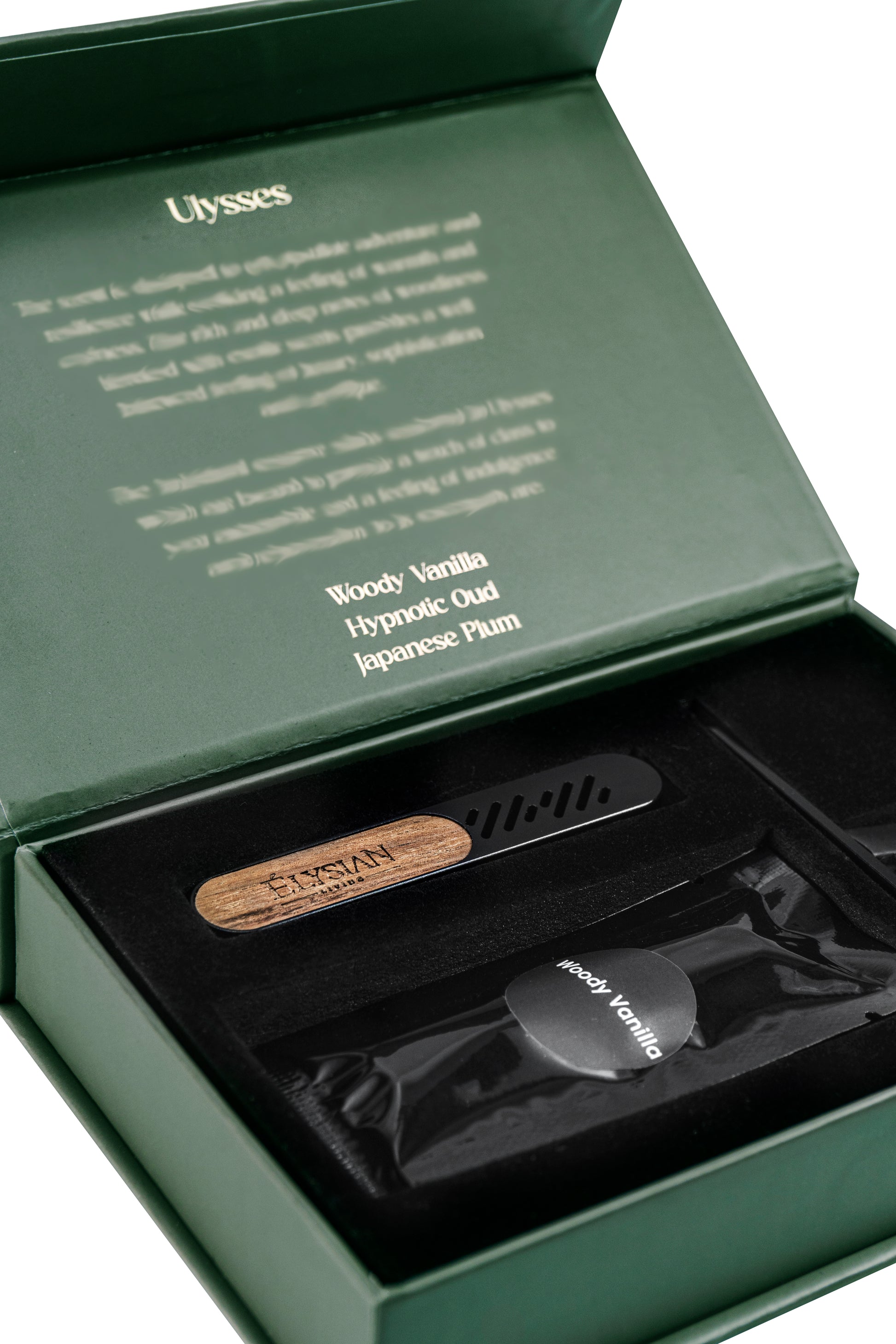 Contains three well curated essence tablets - Hypnotic Oud, Japanese Plum and Woody Vanilla.